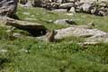 Dans les jardins zoologiques, il n’est pas rare que les marmottes vivent plus ou moins libres, souvent malgré les souhaits des gardiens. En dépit de toutes les précautions prises, il arrive fréquemment que les marmottes rongent les grilles et passent au travers, ou creusent des terriers au-dessous des murs d’enceinte des périmètres qui leur sont réservés. C’est ainsi qu’au zoo de Francfort, il y a quelques années, les marmottes ont vécu plus souvent à l’extérieur qu’à l’intérieur de leur enclos. Il faut savoir qu’à partir du moment où elles se sont installées dans un endroit et y ont creusé leur terrier, elles ne se préoccupent pas de s’en éloigner et même entreprendre de longues excursions exploratoires. A vrai dire, en montagne, une famille de marmottes règne sur un quart d’hectare. Si on dépose leur nourriture à l’entrée de leur maison, de sorte qu’elles n’aient pas besoin de couper de l’herbe, alors elles deviennent encore plus indolentes. Les marmottes du zoo de Francfort avaient creusé des trous pour passer sous les murs de leur enclos, de telle sorte qu’à côté, il y avait dans la terre des sorties du terrier. Cela ne présentait guère d’inconvénient pour les gardiens ou pour les visiteurs, mais c’était très désagréable pour les chiens. Quand il en passait un, le mâle se précipitait sur lui, lui sautait au cou pour essayer de le mordre. On craignit aussi qu’une fois un de leurs couloirs souterrains débouchât au jour, en plein dans l’enclos des renards. Alors les renards les auraient tuées ou au contraire les marmottes auraient mordu à mort les renards.